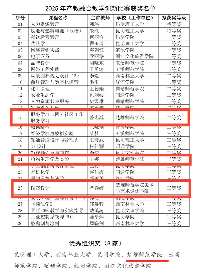 近日,云南省高校产教融合发展联盟发布《关于公布2025年产教融合教学创新比赛获奖结果的通知》,我校推荐参赛的三支教师团队全部获奖,荣获二等奖1项、三等奖2项。同时,学校因赛事组织工作表现突出,被授予“优秀组织奖”。